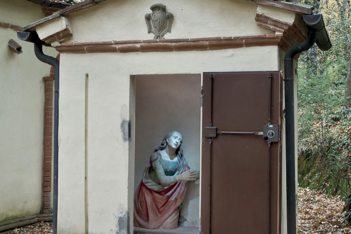 The chapel, which takes the form of a small temple, contains a depiction of the meeting between Jesus and Mary Magdalene, which took place near the tomb after the Resurrection. The woman, who has just recognized the risen Christ in the beautiful young man in front of her, is on her knees and holds her hands outstretched. Jesus, as the Gospel of John narrates, asks her not to cling to him ( Noli me tangere : lit. touch me not) because he had not yet ascended to the Father. According to scholars, the statue of Mary Magdalene, depicted with a broad, serene face and naturally loose hair, is reminiscent of the identical figure from the Pietà group located inside the monastery church, and for this reason, it seems to indicate the hand of Agnolo of Polo. The statue of Christ is unfortunately mutilated, due to a theft that occurred in recent times.