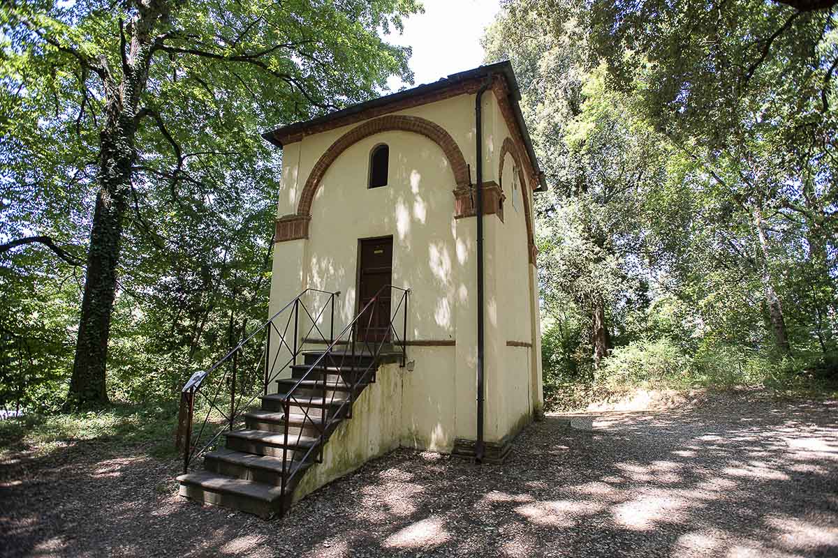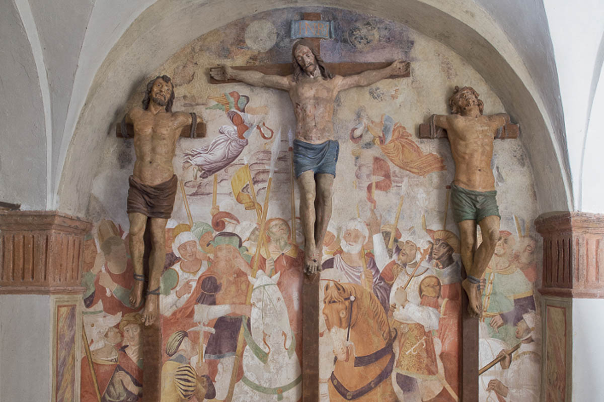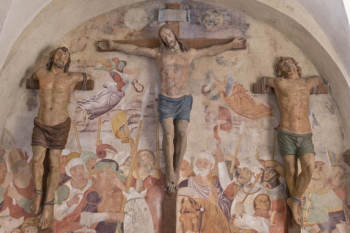 La cappella a base quadrata, con due arcate in cotto su pilastri d’angolo, ospita la scena più drammatica della Via Dolorosa, la Crocifissione di Cristo tra i ladroni. La parete con le tre croci addossate offre un ulteriore esempio di brillante integrazione prospettica tra affresco e terrecotte, tra le quali si evidenzia il maggior dinamismo che percorre i corpi contratti dei ladroni rispetto al volto e alla posa più convenzionali del Cristo. Annessa all’edificio è l’Edicola dello Stabat Mater, in cui le statue di Maria, Giovanni e le Pie Donne, poste a un livello inferiore rispetto al basamento della cappella, ma in comunicazione visiva con il vano delle croci, partecipano in disparte all’agonia del Cristo, con un effetto scenico di grande intensità suggestione. La crepa che percorre il pavimento e prosegue sulla parete esterna della cappella allude al terremoto che, secondo la tradizione evangelica, scuote la terra al momento della morte di Cristo.
