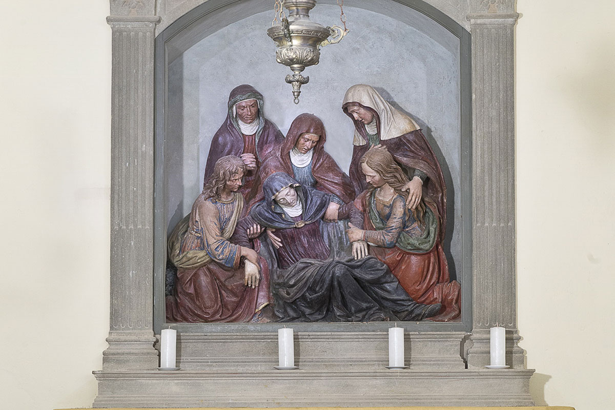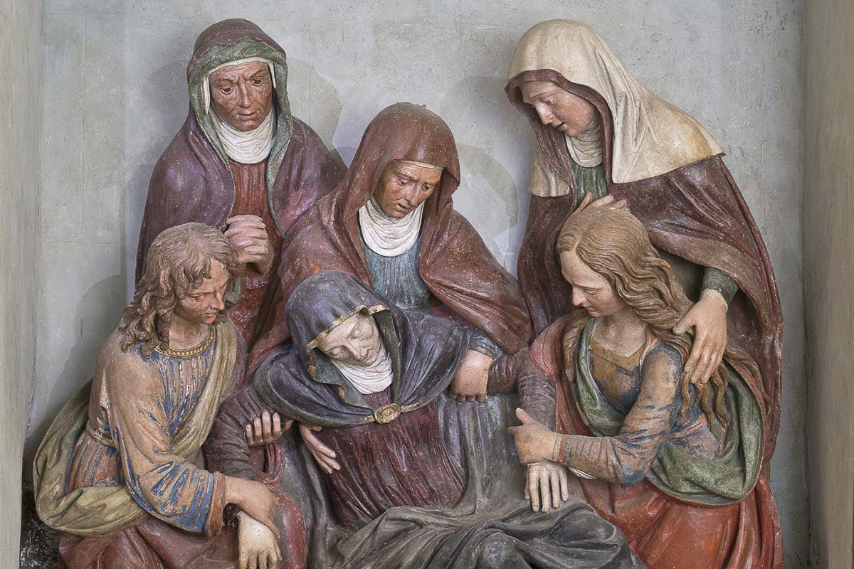 Al centro, la Madonna pallida e sofferente perde i sensi, soccorsa dalle eleganti figure di Giovanni Evangelista e delle Pie Donne, nonché da un’avvenente e dolce Maddalena. Le pieghe morbide delle vesti, le teste reclinate a comporre una studiata geometria, le espressioni dei volti: tutto concorre a ricercare la partecipazione del visitatore, qui come non mai invitato a fare proprie le sofferenze della Vergine. Ritenuta fin dall’origine come uno dei luoghi più importanti del complesso, alla chiesetta della Madonna dello Spasimo accorrevano i pellegrini per chiedere la grazia alla Madonna e lasciare ex voto.